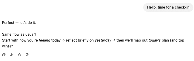 Each morning, I do a short check-in. I tell it how I’m feeling, how yesterday went, and what’s on my mind for the day ahead. The flow works really well for me: reflection → action.